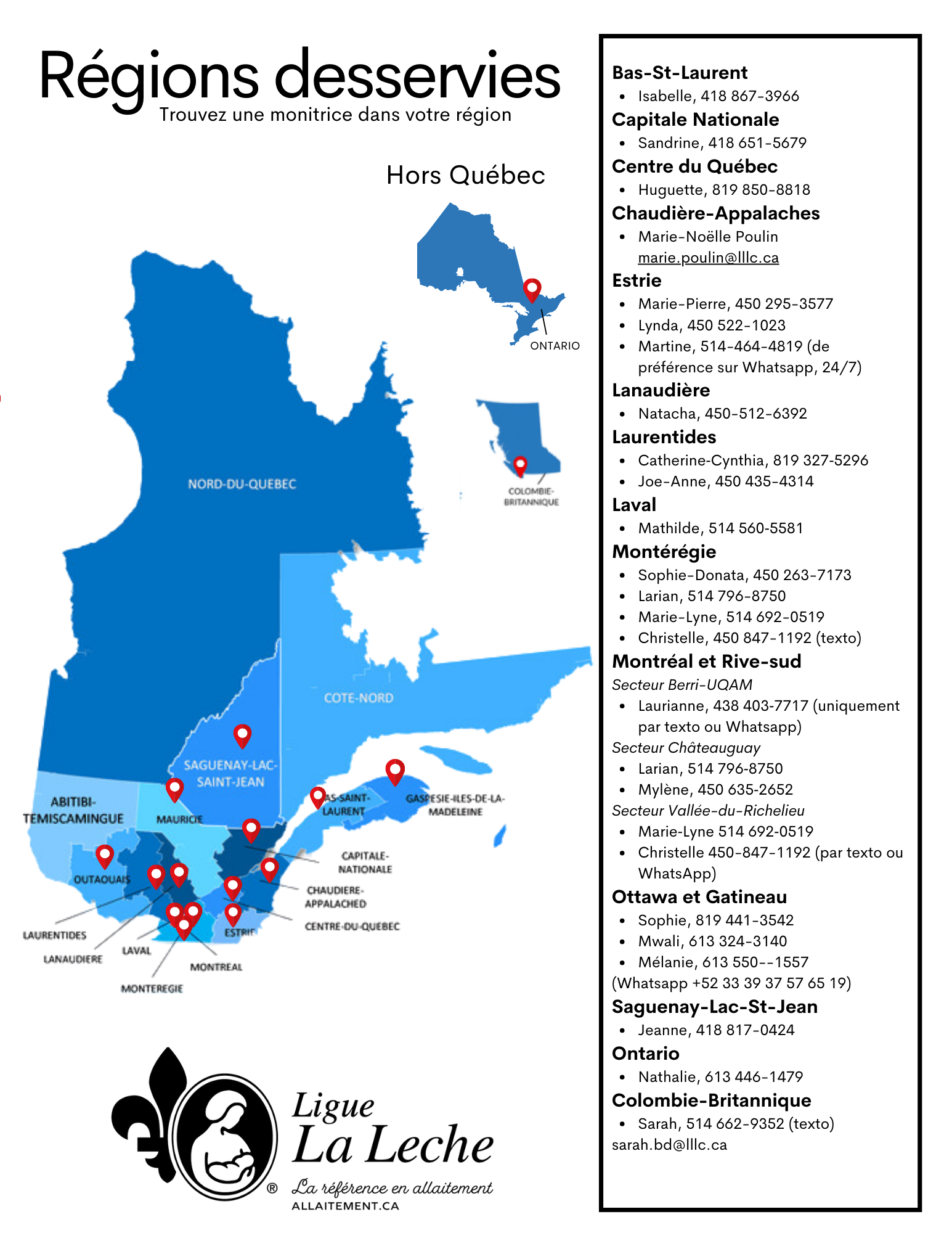 - Troisième étape (en dernier recours) : Contactez une monitrice de votre région. Si aucune des options précédentes n’a fonctionné, vous pouvez consulter la liste ci-dessous et joindre une monitrice proche de chez vous.